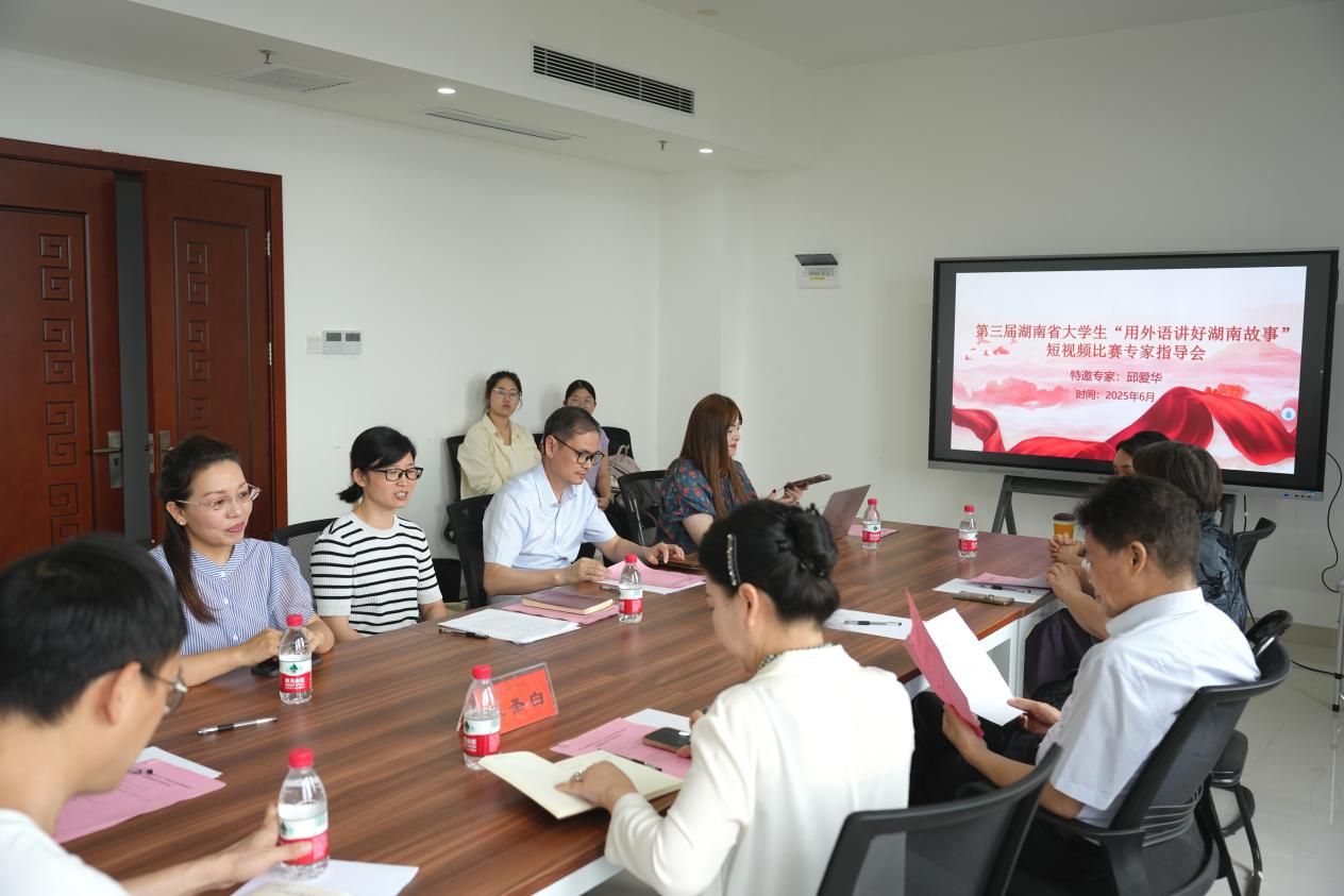 6月10日下午,52av 特别邀请省外事办一级巡视员邱爱华为湖南省大学生“用英语讲好湖南故事”短视频大赛做专业指导。52av 党委书记何培森,国际交流与港澳台事务处副处长(主持工作)陈圣白,52av 副院长王佳娣、陈艳君,参赛作品指导教师以及学生团队代表参加了指导会。指导会由王佳娣主持。