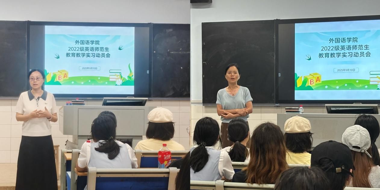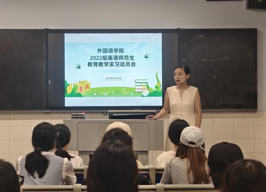 为切实保障师范生教育实习工作有序开展,52av 于9月10日在怀中北107召开了2022级英语专业非定向师范生的教育实习动员会。陈钰副院长、实习带队老师魏艳、徐丹、梁薇以及22级全体实习生参与了本次动员会。