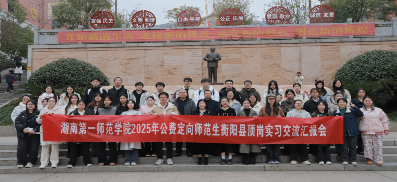 为深化校地协同育人,检验公费定向师范生实践成效,1月16日下午,我校联合衡阳县教育局在衡阳县实验学校召开2025年公费定向师范生顶岗实习交流汇报会。县教育局人事科股长夏伯平、实验学校校长方红兵、副校长李朝晖、政工室副主任朱琰及我校指导老师钟玲俐博士出席,共同检阅实习成果。