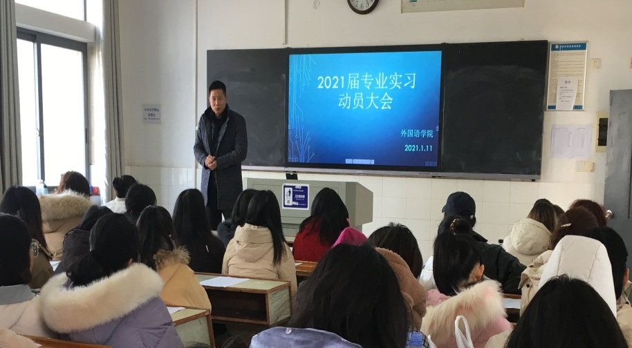 为进一步完善毕业生实习工作,引导学生做好实习心理准备,2021年1月11日,52av 17英语6班、17翻译班全体学生在怀中楼北307教室召开了2021届专业实习动员大会。会议由教科办教师廖爱秀主持,52av 副院长刘宇松、党总支副书记杨虎智、辅导员张明、实习带队指导教师陈钰、谭双顺、李森林以及17级非师范班学生共八十余人参加了此次会议。