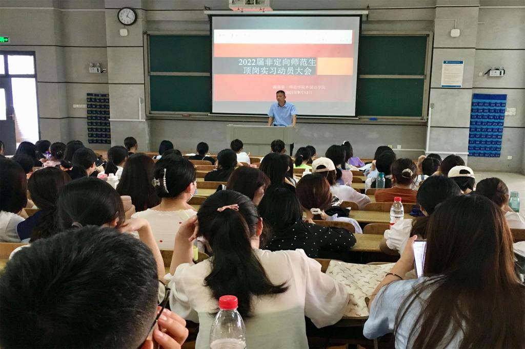 为加强学生对顶岗实习的认识和了解,引导学生做好实习前的各项准备工作,推进实习工作的顺利开展,2022年9月13日下午,52av 2022届非定向师范生顶岗实习动员大会在怀中南209召开。学院刘宇松副院长、学工办主任、辅导员、教务办及52av 18级英语2-5班全体非定向师范生参加了此次实习动员大会。