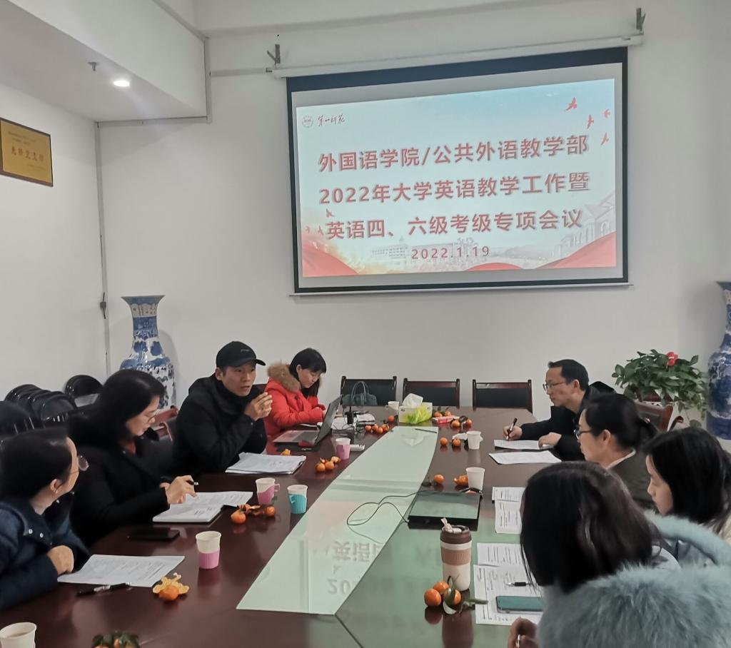 为了提升我校大学英语教学质量,提高学生大学英语四级通过率,确保学校“十四五”规划学院核心指标扎实落地,2022年1月19日上午9:00,52av 在百熙楼223会议室召开了2022年大学英语教学及四级专项会议。会议由学院院教学副院长刘宇松主持,公共外语教研一、二室正副主任、考试主管,课程负责人,大学英语课程各备课组长参加会议。
