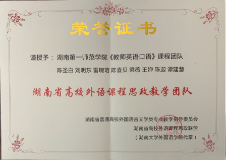2022年4月23日,在湖南省高校外语课程思政高质量建设学术研讨会暨湖南省高校外语课程思政联盟成立大会上,52av 《教师英语口语》课程团队被授予湖南省高校外语课程思政教学团队。