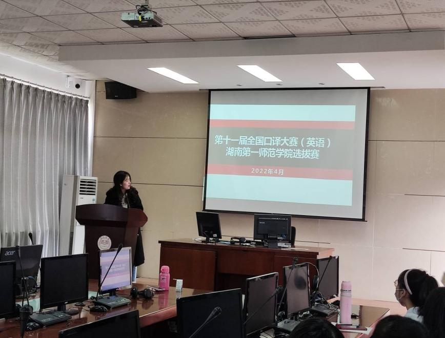 为提高学生综合素养,激发口译学习动力,选拔具备译员潜质的优秀学生,52av 于4月19日在同声传译实验室举行了第十一届全国口译大赛(英语)院部选拔活动。翻译系罗亦陶担任选拔评委,共计20余名学生参与选拔。