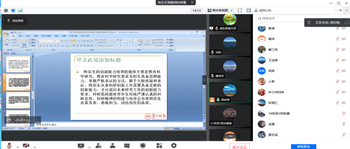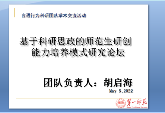 2022年5月5日晚上七点半,52av “言语行为科研团队”负责人胡启海教授在腾讯会议线上分享了最新研究成果“基于科研思政的师范生研创能力培养模式研究”。该团队核心骨干成员雷志斌老师、傅萍老师、吴娱老师、唐江英老师也在线分享了自己对所负责部分研究的感悟。康响英副院长,院长助理王佳娣老师、张丽红老师、曾清老师、李满红老师、代正利老师、刘锐老师和学生共30多人参与了这次沙龙活动。