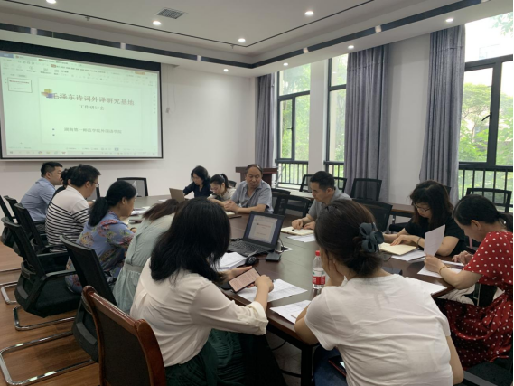 为了更好地推进毛泽东诗词外译研究基地的建设,6月2日下午,52av 在百熙楼214会议室举行了“毛泽东诗词外译研究基地工作研讨会”。本次研讨会特邀我校科研处田祖伟副处长莅临现场指导,52av 刘祥清书记、陈圣白副院长(主持工作)、刘宇松副院长、康响英副院长、禹晗副书记、刘明东教授、翻译系主任陈钰以及毛泽东诗词外译研究基地的主要成员参加了本次研讨,活动由康响英副院长主持。