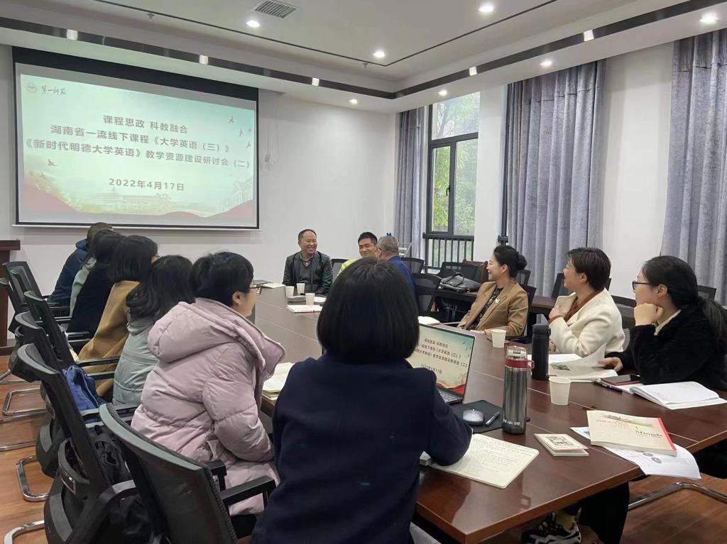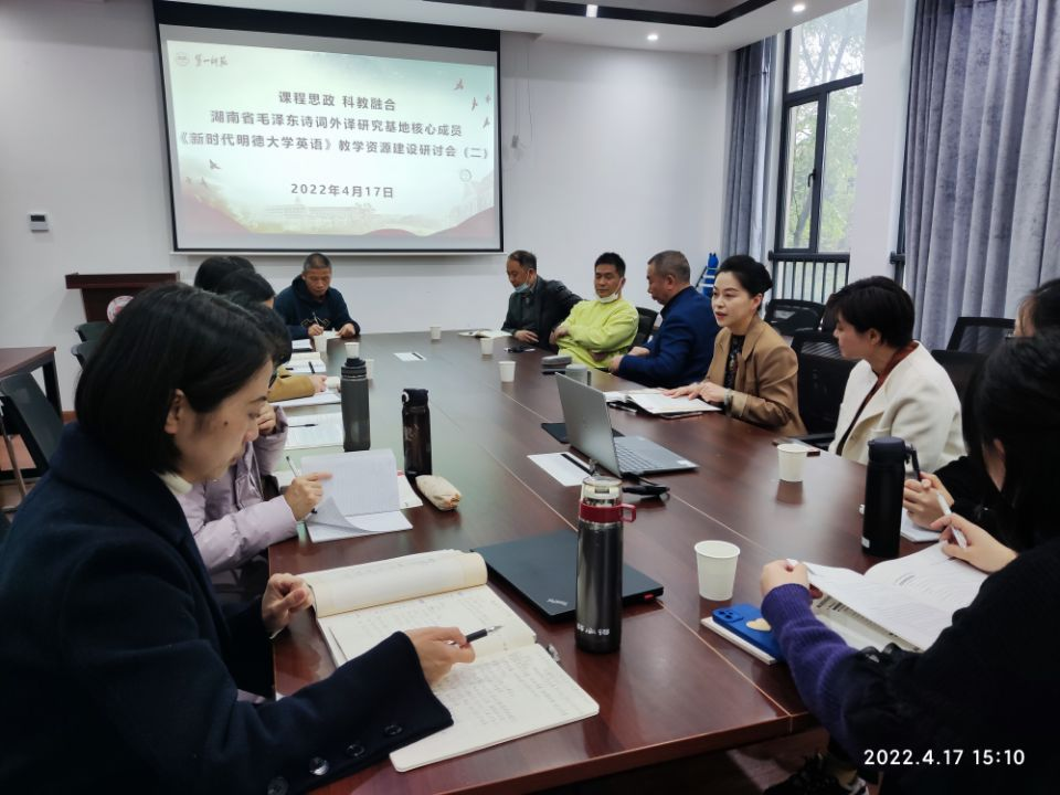 为进一步推进《大学英语》课程思政建设,“湖南省毛泽东诗词外译研究基地”核心成员与湖南省一流线下课程《大学英语(三)》课程组成员于2022年4月17日在52av 会议室再次举行了基于课程思政的《新时代明德大学英语》教学资源建设研讨会。会议特别邀请了《新时代明德大学英语》主编湖南大学52av 刘正光教授、何岚教授前来指导。整个会议由52av 陈圣白副院长(主持工作)主持,参加会议的有52av 刘祥清书记、刘宇松副院长以及陈喜贝、龙君、梁薇、雷琬瑢、唐新萍、谭建慧、陈迎、蒋丽梅等老师,高等教育出版社湖南省教学服务中心李云峰副主任莅临会议。