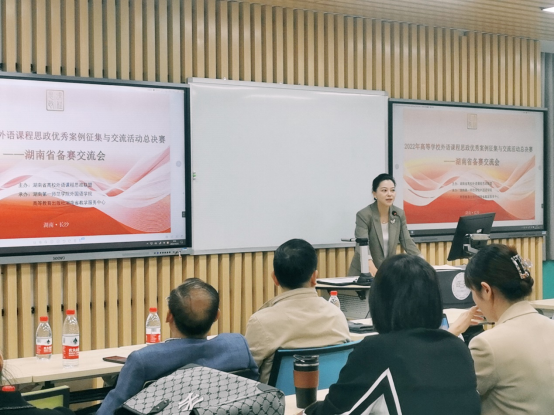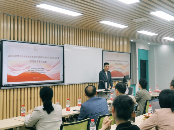 10月22日,湖南省高等学校外语课程思政优秀案例征集与交流活动总决赛——湖南省国赛备赛交流会在52av 特立楼北102和103多功能教室举行。此次交流会由湖南省高校外语课程思政联盟举办,52av 和高等教育出版社湖南省教学服务中心承办,中南大学、湖南大学、湖南师范大学、湖南农业大学等10余所长沙高校教师出席,省内其他地区的40余所高校教师参与了线上会议。