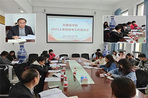3月7日下午,52av 在百熙楼223举行了英语专业四级考试迎考座谈会。52av 副院长唐文杰、翻译系主任陈钰、教务办主任廖爱秀、教师代表以及2020级和2021级学生代表参加本次座谈。唐文杰主持会议。