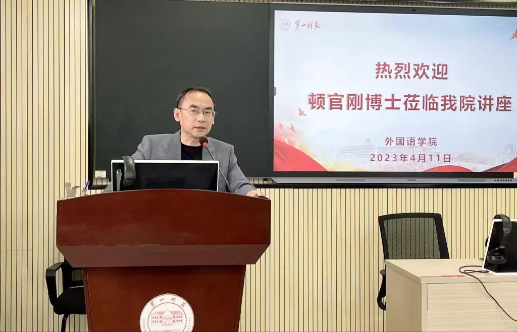 2023年4月11日下午,应52av 特邀,湖南师范大学52av 顿官刚博士在怀中北602做题为“本科翻译专业:困境与出路”的讲座。院党委书记刘祥清,副院长(主持行政工作)陈圣白,副院长唐文杰、副院长康响英、无课教师和翻译专业学生代表参加此次讲座。讲座由副院长唐文杰主持。