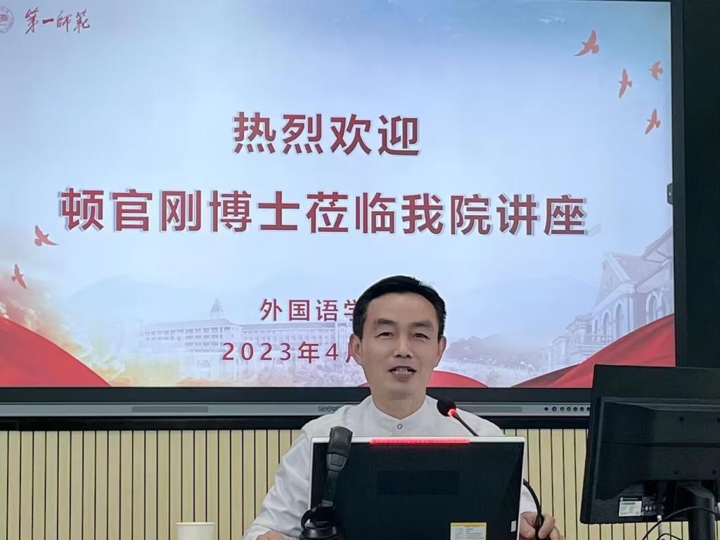 顿官刚博士用生动的语言、鲜活的案例深入浅出地讲解了如今翻译专业所面临的困境。顿博士指出要想走出现如今的困境,唯一的出路就是要正本清源,坚定专业价值信念,加强专业内涵建设,对标专业人才培养目标设置课程体系。要坚持以读促学理念,强化学生语言基本功;不断改进教学方式,提升教学的专业化、人文化品质,彰显翻译专业人才培养的社会意义。顿教授还现场授课,积极与学生互动,展示了精湛教学的教学艺术和深厚的专业功底。顿博士的讲座视野开阔,理实结合,既厘清了我国翻译专业发展脉络,又为外院翻译专业建设指明了方向和路径。在座师生都受益匪浅。