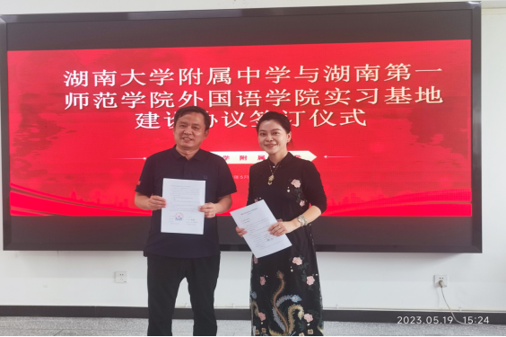 双方就我们提出的希望湖大附中能够成为我们的师范生教育实习教学基地、开展教研合作等事宜进行了交流探讨。蒋校长代表学校表态,湖大附中愿意成为52av 英语专业师范生培养的教育实习基地,承诺附中会为52av 师范生制定科学合理的实习方案、创造良好的实习环境、配备优秀的实习指导教师,希望双方共同努力提高教育实习的实效性,期待今后能开展深度的交流与合作。之后,蒋校长和陈院长代表双方单位共同签署了教育实习基地建设协议。在谢洨副校长的主持下,双方就实习人数安排、实习内容衔接、实习环节安排、实习课程建设、师范技能培养等细节展开广泛研讨。本次教育实习基地的签约充分展示了52av 与地方教育资源的有机结合,推进了52av 与优质中学协同培养新时代中学英语教师的进程,扩大了52av 的区域性社会影响。