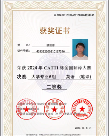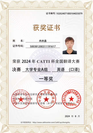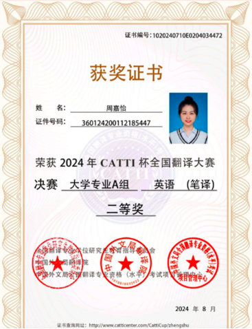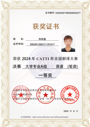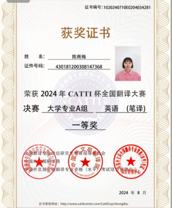 2024年8月,由全国翻译专业学位研究生教育指导委员会和中国外文局翻译院联合主办的2024年“CATTI杯”全国翻译大赛全国总决赛圆满落幕。我校学生在本次比赛中表现优异,取得了三个一等奖,三个二等奖,两个三等奖的好成绩。冉林鑫、陈雨梅同学获得笔译赛项一等奖,冉林鑫获得口译赛项一等奖,周嘉怡、王乐婷、侯佳源获得笔译赛项二等奖,韩非宏、刘诗颖获得笔译赛项三等奖。