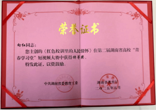 5月20日,第二届湖南省高校“青春学习堂”短视频大赛颁奖典礼在中南林业科技大学举行,52av 副教授向红博士凭借作品《红色校训里的人民情怀》荣获教师组特等奖。