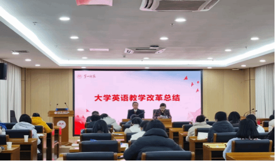 副院长陈钰对大学英语教学改革做了全面总结,从四级通过率、竞赛成绩、学生良性学习生态形成以及教师团队凝聚力四个方面肯定了阶段性可喜成效,表示要砥砺前行再出发,明确下一步改革发展重点构想。
