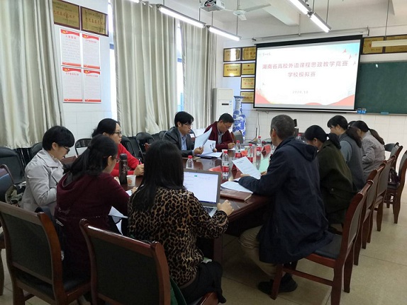 2020年10月21日下午,湖南省高校外语课程思政教学竞赛学校模拟赛在怀中楼北605如期举行。公共英语选手陈喜贝团队、外语专业选手李双团队、52av 党总支书记李亚林、52av 4位教研室主任现场观摩了模拟赛。