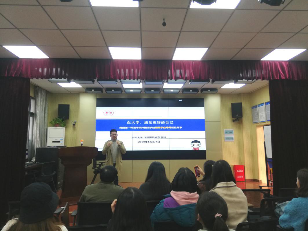 目前攻读湖南大学汉语国际教育硕士的2015级外院学子陈雄以“在大学,遇见更好的自己”为主题,分享了自己在本科期间丰富的课外活动和开展学生工作的经验,鼓励大家提高自己的视野,不断认识自我、完善自我,并在这个过程中成就自我。除此之外,他还向大家讲述了如何备战考研,提醒同学们做好清晰的规划,有计划地复习,提高学习效率。