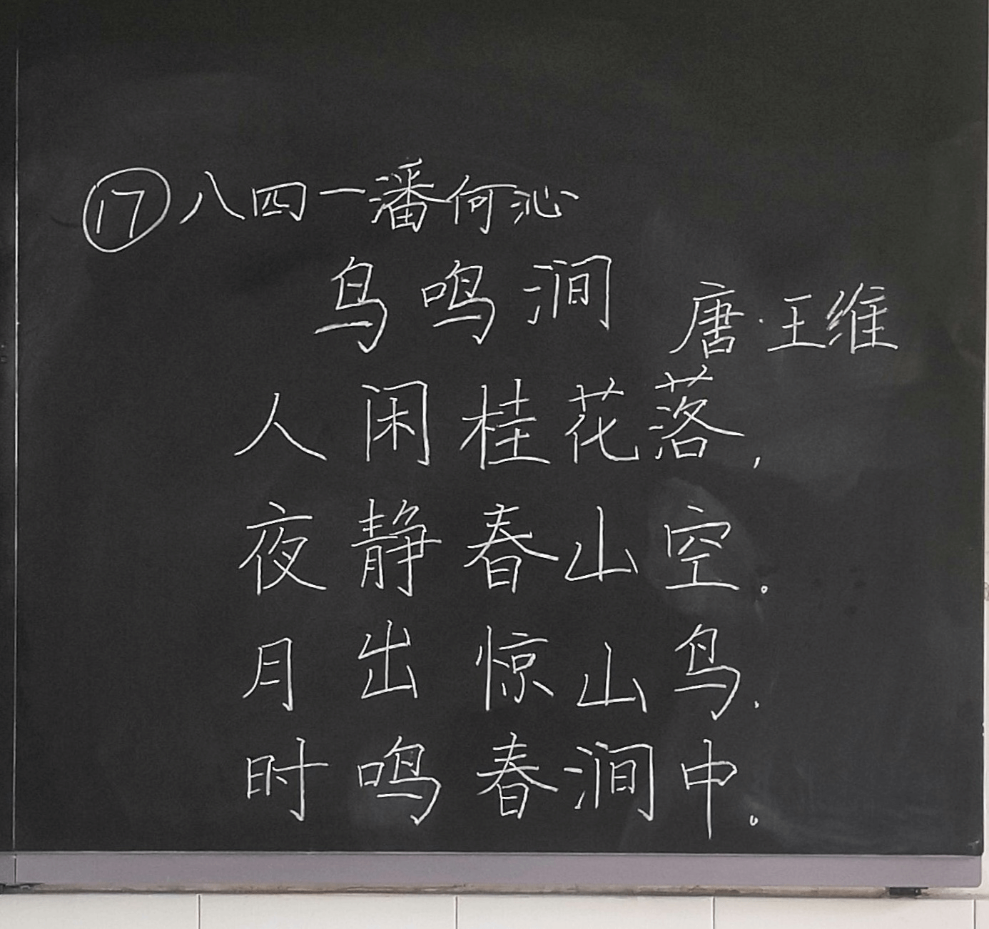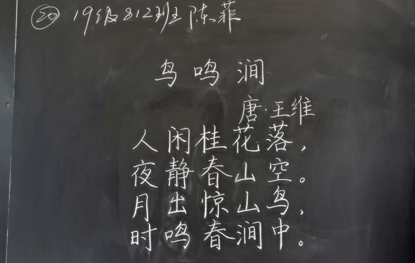 比赛开始时,每个教室安排两名选手去黑板上进行书写,或是在自带的小黑板上进行书写。比赛内容为一首五言诗《鸟鸣涧》,比赛时间为8分钟。书写完成后,选手拍照发院部汇总,院部安排评委进行评分。