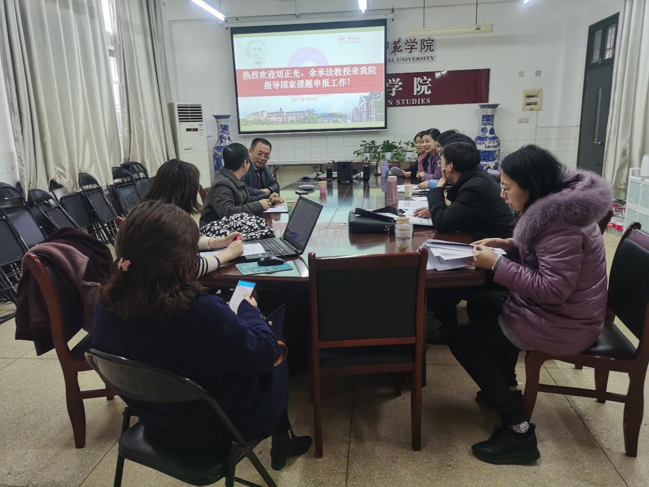 为提升2021年度全国教育科学规划课题与教育部人文课题申报质量,3月9日下午,应52av “乐之”论坛邀请,湖南大学刘正光教授、湖南师范大学余承法教授来52av 指导。会议由康响英副院长主持,52av 教授、博士,与部分教师参与了此次会议。