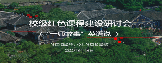 为适应新时代教育要求,落实“立德树人”根本任务,推动校级红色课程建设,52av /公共外语教学部“‘一师故事’英语说”教学团队于2022年6月16日在百熙楼223室进行了红色课程建设专题研讨。研讨活动邀请教务处副处长唐文杰和外院教学副院长刘宇松莅临指导,“‘一师故事’英语说”教学团队全体成员参加。研讨活动由陈喜贝主持。