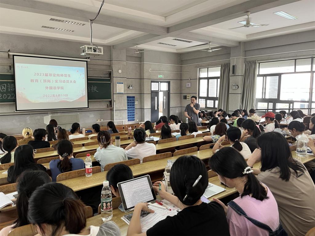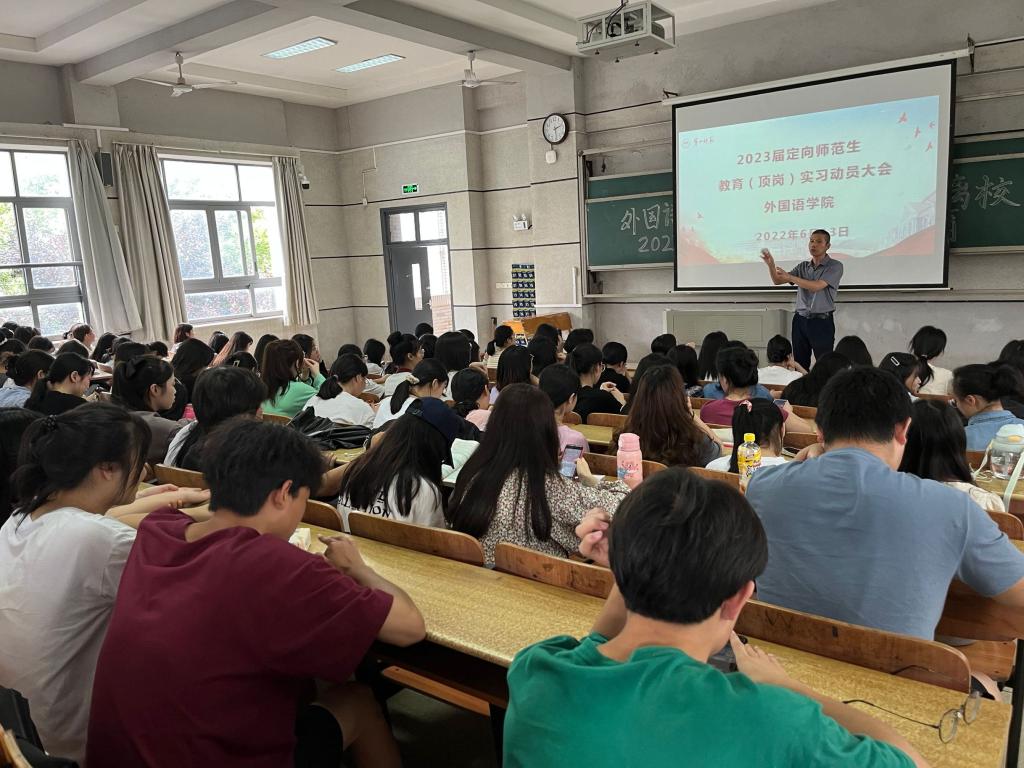 2022年6月13日下午,52av 在怀中楼南209分两批次(定向师范生和非定向师范生)举行2023届毕业生顶岗(教育)实习动员大会。外院刘宇松副院长、禹晗副书记、教务办主任廖爱秀、毕业班辅导员、实习指导老师和定向和非定向师范生参加了会议。