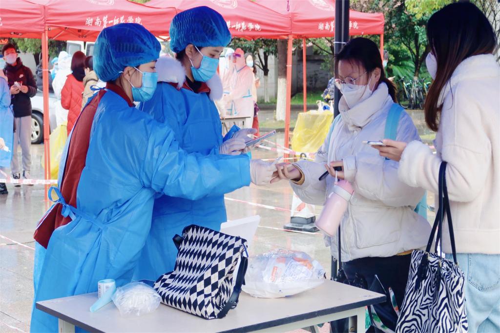 绵绵细雨之中,“红马甲”们一手紧握扩音喇叭,一遍又一遍耐心地提醒着同学们保持安全距离,另一手拿着医用口罩,穿梭于队列之间,及时派发到同学们的手上。“蓝防护服”们时刻坚守在信息录入岗位:他们贴心地叮嘱同学们提前打开健康码,细致地录入身份信息,将采样器送到每一位同学的手心。天气虽然寒冷,但同学们的心却是暖烘烘的。核酸检测的队伍从玉衡楼南排至润寰楼北,在焦急又难耐的气氛中,人群中鲜明可见的那一抹“红”和一点“蓝”,抚慰了每一位同学的心。