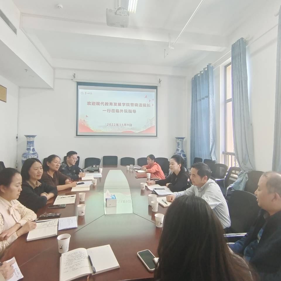 11月9日下午,现代教育学院书记祝娅、院长曾晓洁一行来到52av 调研教师教育培训等工作。学院全体院领导、主持52av 国培工作的刘明东教授、唐新萍、李彩琴、廖嘉琰老师参加了本次座谈会。调研会由陈圣白副院长(主持行政工作)主持。