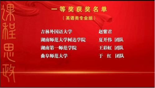 11月25至27日,2022年外语课程思政优秀教学案例全国交流活动如期在云端举行。通过层层严格选拔,最终来自全国各地高校的26个教师团队进行了决赛的激烈角逐。我校52av 王彩虹、陈圣白、周敏、陈清、刘霞团队荣获外语类英语专业组全国一等奖,这是52av 继2021年全国外语课程思政比赛后再创佳绩。