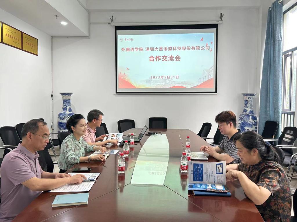 5月31日上午,52av 与深圳火星语盟科技股份有限公司开展访企拓岗合作交流进行洽谈,双方在学院会议室百熙楼223进行。深圳火星语盟科技股份有限公司华中区校企负责人袁俊涛、学院副院长陈圣白(主持行政工作)、党委副书记戴建宇、副院长唐文杰以及教科办主任廖爱秀等共同参加。