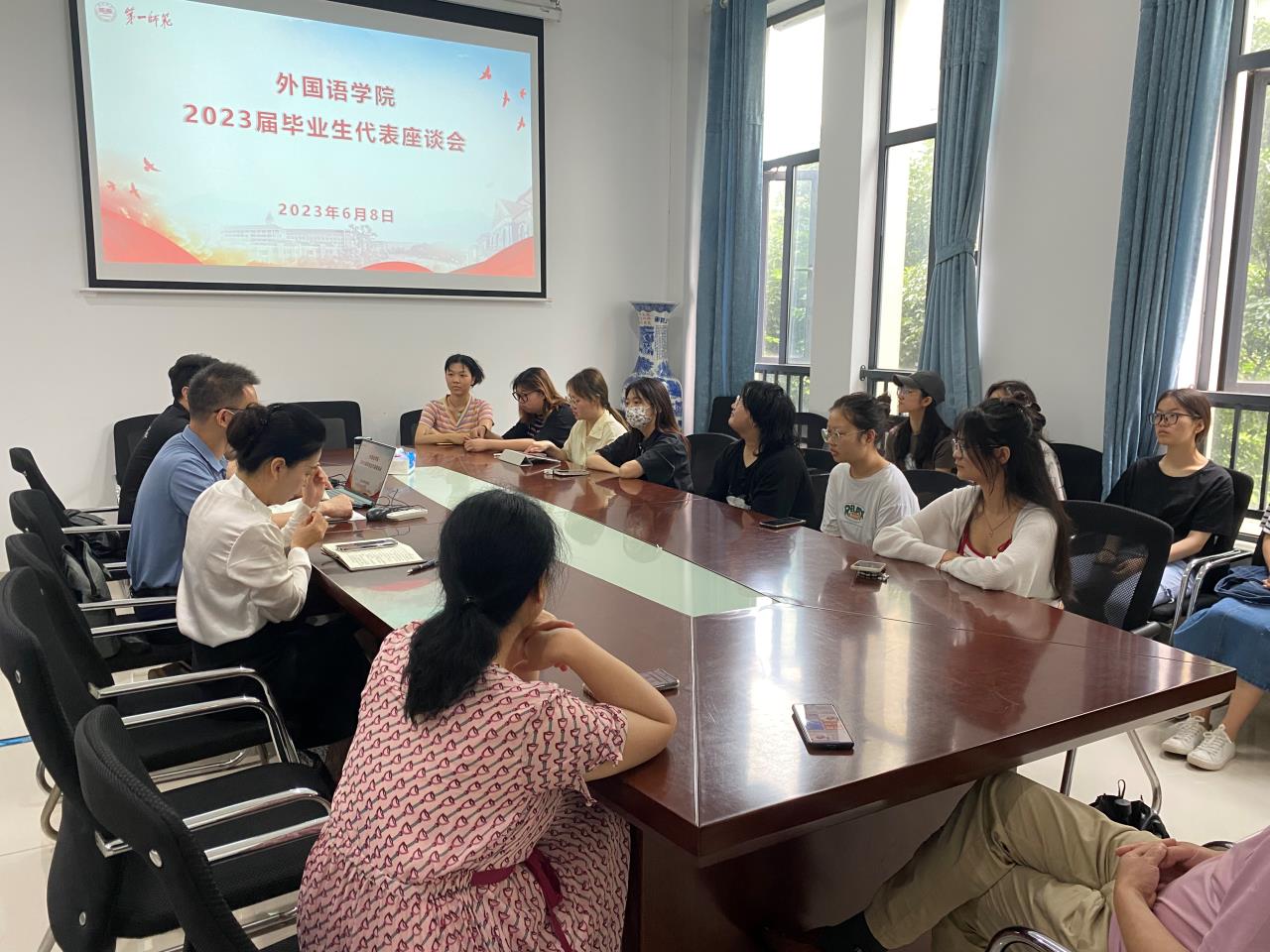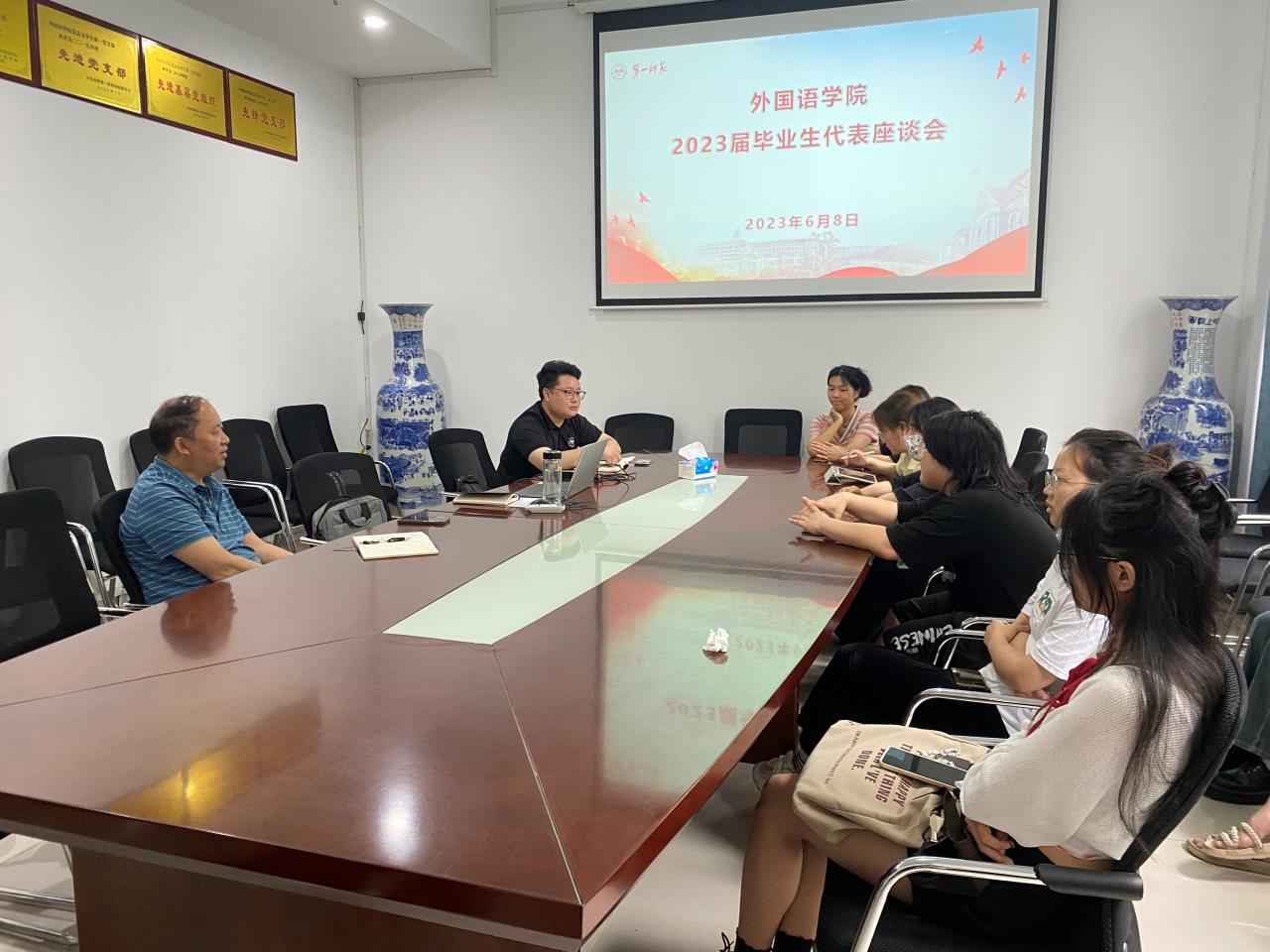 6月8日上午,52av 在百熙楼学院会议室223召开2023届毕业生代表座谈会。学院党委书记刘祥清、副院长(主持工作)陈圣白、党委副书记戴建宇、副院长康响英和唐文杰出席会议,教师代表及各班级毕业生代表参加了此次会议。会议由学院党委副书记戴建宇主持。