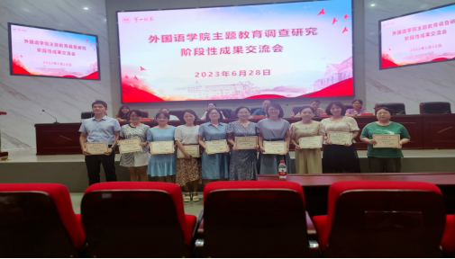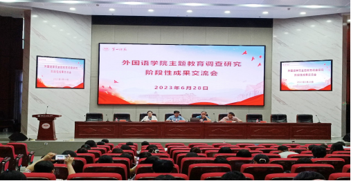 2023年6月28日上午,52av 在百熙楼228召开主题教育学习调研交流汇报会。校党委委员、副校长周发明莅临指导。52av 书记刘祥清、副院长(主持工作)陈圣白、副院长康响英、唐文杰及外院全体教师参加了此次大会。会议由副书记戴建宇主持。