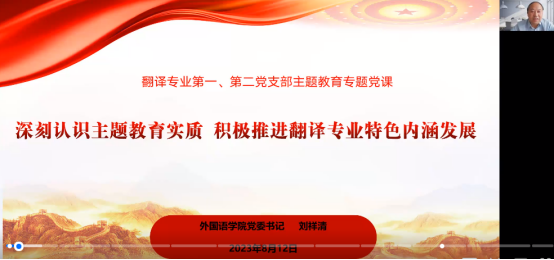 2023年8月12日下午,52av 党委刘祥清书记应邀为翻译系两个党支部作了题为“深刻认识主题教育实质,积极推进翻译专业特色内涵发展”的主题党课。本次会议由翻译系第二党支部书记胡启海教授主持,翻译系第一、第二党支部全体党员参加了这次党课。