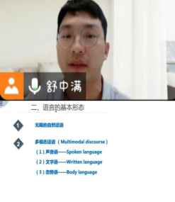 舒中满老师生动地讲解了语言的方方面面,比如语言的基本形态以及语言的多样性。多模态话语作为语言的基本形态之一,舒老师对其系统而又具体的讲解让同学们茅塞顿开,激发了他们对生活中的语言的兴趣。另外,舒老师带领同学们了解了共同语和方言,让大家认识到语言并不是一个普通死板的工具,不论是口语还是手势都能给受众带来很多信息和感受。