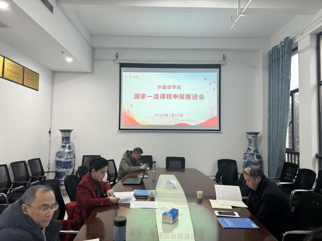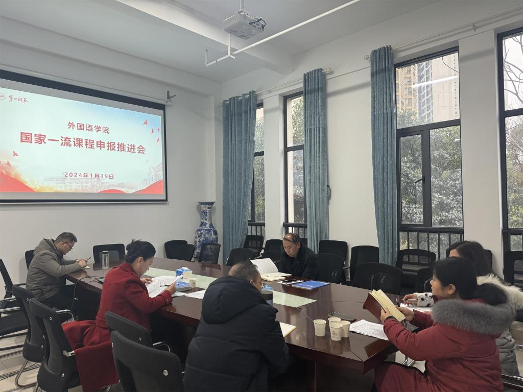 为推进国家一流课程建设工作,进一步加强课程建设工作规划与指导,1月19日,52av 在百熙楼223召开国家一流课程申报推进会议,全体院领导、综合英语课程申报团队成员参会。