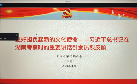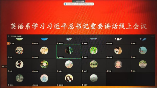 4月2日晚,英语系全体教师响应学校和学院号召,以强烈的荣誉感、责任感和使命感,全面系统地学习习近平总书记考察我校时的重要讲话,在深学细悟中领会习近平总书记的讲话精神。学习活动由系副主任王曼老师主持,英语系第一党支部书记彭熠博士、英语系第二党支部书记雷志斌博士、支部委员李爱华老师、王彩虹老师和刘霞老师等先后领学并做主旨发言。