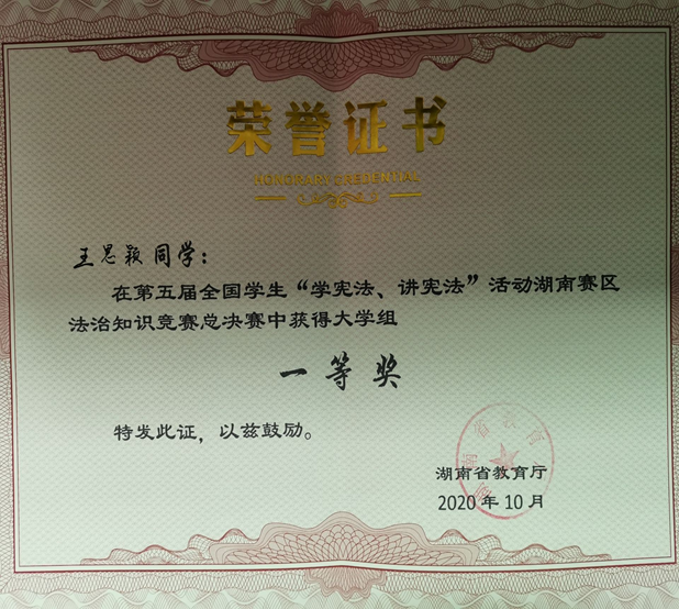 此次“学宪法讲宪法”活动比赛共有初赛和决赛两个环节。52av 王思颖同学在马克思主义学院肖霄老师的指导下认真学习宪法知识,完成好每一道学习题库中的题目,经过半个月的反复练习和老师的要点指导,王思颖同学最终获得第五届全国学生“学宪法讲宪法”活动湖南赛区法制知识竞赛总决赛大学组一等奖的好成绩。