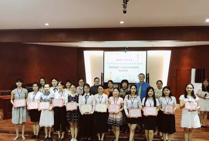 2017年5月20日上午9:00,52av 2017年英语演讲比赛专业组决赛暨湖南省第二十三届大学生英语演讲比赛专业组选拔赛在科技楼模拟法庭成功举办。此次比赛由教务处主办,52av 承办。出席本次活动的领导有现代教育技术中心处长朱承学、教务处副处长李建亚和52av 副院长康响英。担任此次评委的有外院康院长、外教Brandon以及4位专业教师。