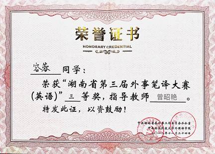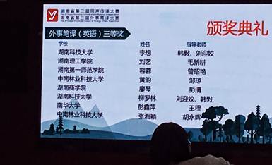 2018年11月24日,由湖南省人民政府外事侨务办公室主办,中南林业科技大学承办的湖南省第三届同声传译大赛和外事笔译大赛在中南林业科技大学举行。共有21所省内本科院校、250多位本科生及研究生参赛。我校52av 容蓉等8名同学参加了此次大赛,与来自中南大学等一本院校的研究生同台竞技。经过一天的激烈角逐,52av 学生取得了良好的成绩,由曾昭艳老师指导的15英语1班容蓉同学获外事笔译(英语)大赛三等奖。