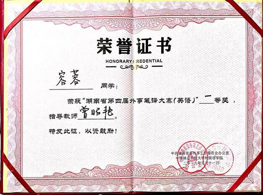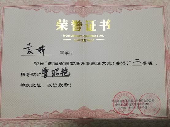 2019年5月11日,由中共湖南省委外事工作委员会办公室主办,中南林业科技大学承办的湖南省第四届外事口译大赛和外事笔译大赛在中南林业科技大学举行。来自湖南省近30所高校和涉外单位的300余名选手“译”决高下。我校52av 容蓉、袁娇等6名同学参加了此次大赛,与来自中南大学、湖南师范大学等一本院校的研究生同台竞技。经过精彩激烈的角逐,52av 学生取得了良好的成绩,由曾昭艳老师指导的15英语1班容蓉同学荣获外事笔译(英语)大赛一等奖、17英语6班袁娇同学荣获外事笔译(英语)大赛二等奖。