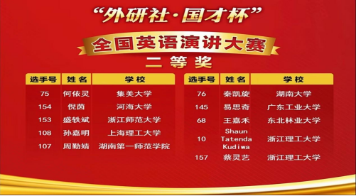 “外研社·国才杯”全国英语演讲大赛是目前大学生参与度最高、社会认可度最高的全国大型英语赛事之一,大赛自2018 年起连续五年入选教育部中国高等教育学会发布的“全国普通高校大学生竞赛排行榜”。今年的决赛由30个省、自治区、直辖市及澳门特别行政区推荐的90名选手和通过网络赛道产生的93名选手,共计183位选手共赴云端之约,同台竞技。由周敏和李双指导的周勤婧同学经过紧张激烈角逐脱颖而出取得好成绩。这是2014年李子怡获该赛事特等奖之后52av 学生再次闯进全国决赛,获得好成绩。由常远佳老师指导的20英语3班姚苏伦同学荣获全国英语阅读大赛三等奖,也是连续两年进入决赛获奖。这些成绩充分展现了52av 学生扎实的英语语语言基础、语言综合运用能力和良好的精神风貌,展示了52av 在课程教学、专业建设和人才培养等方面的优秀成果。