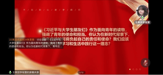 为深入学习贯彻党的二十大精神,推动习近平新时代中国特色社会主义思想的青年化阐释与传播,引导广大青年树立正确的世界观、人生观、价值观,52av 于2024年7月28日举行“青春共读•领袖心语——《习近平与大学生朋友们》第二卷专题读书会”活动。本次活动采取线上形式开展,2022、2023级班干部参加,学生会主席团成员李铭慧主持。