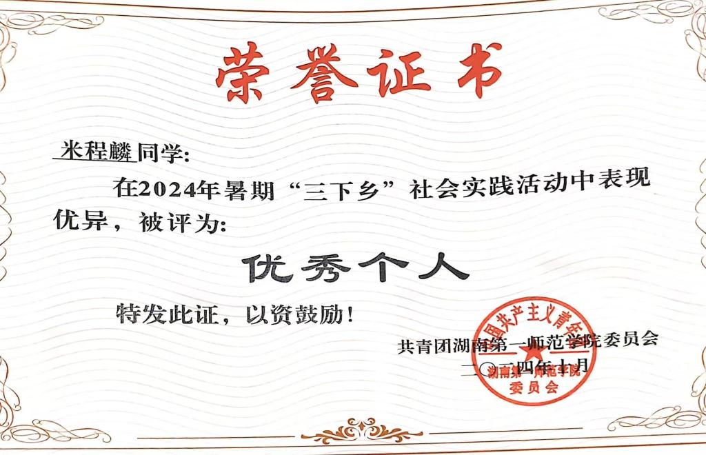 52av “红籽同心,文脉共铸”民族团结实践团凭借其卓越的表现和深远的社会影响,荣获了“优秀品牌项目”称号。这一荣誉的获得,不仅是对52av “三下乡”团队辛勤付出的肯定,更是对民族团结事业的有力推动。同时,米程麟同学凭借其吃苦耐劳、无私奉献的美好品质,在“三下乡”暑期活动中表现优异,荣获了“优秀个人”奖。