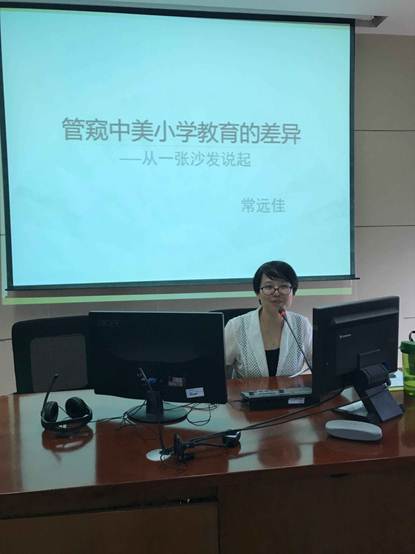 第二场讲座是常远佳博士的以“美国小学教育观察与思考”为主题的讲座。常博士说美国的教育让她印象深刻的有四点:一是平实有力、有可操作性的办学目标;二是教育理念,为什么学,如何学与学什么同等重要;三是学生观,学校认为,师生之间亲密合作的关系是学生高质量学习的基础;四是教学方法,学校建构了一套自身的教学方法,即“质疑、反思、行动”,以提高学生的批判思考、整合知识、应用所学的能力。美国的这些教育理念引发大家对国内的小学教育进行反思,我们应该吸收他人的长处,努力完善自己。