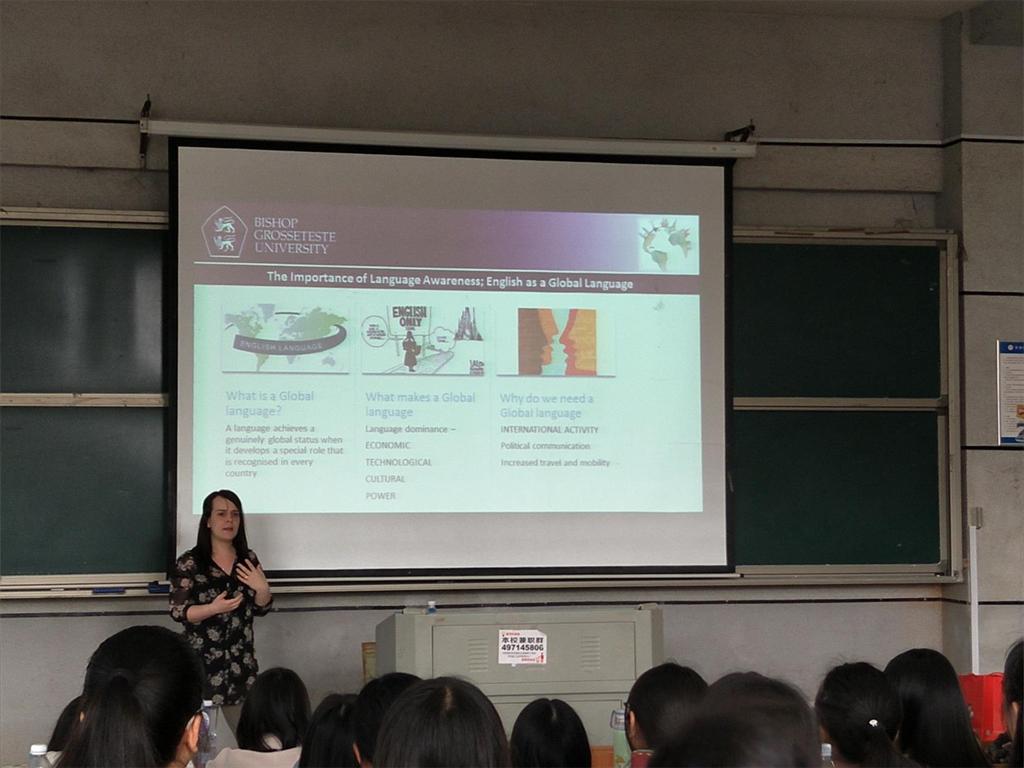 2017年4月13日下午,格罗斯泰斯特主教大学博士AMI MONTGOMERY在文科楼B栋209为52av 学生讲学。讲座题目为Teaching English as a Globle Language。 讲座由52av 副院长康响英教授主持,国际交流处何晓斓副处长与学院部分师生聆听了本次讲座。