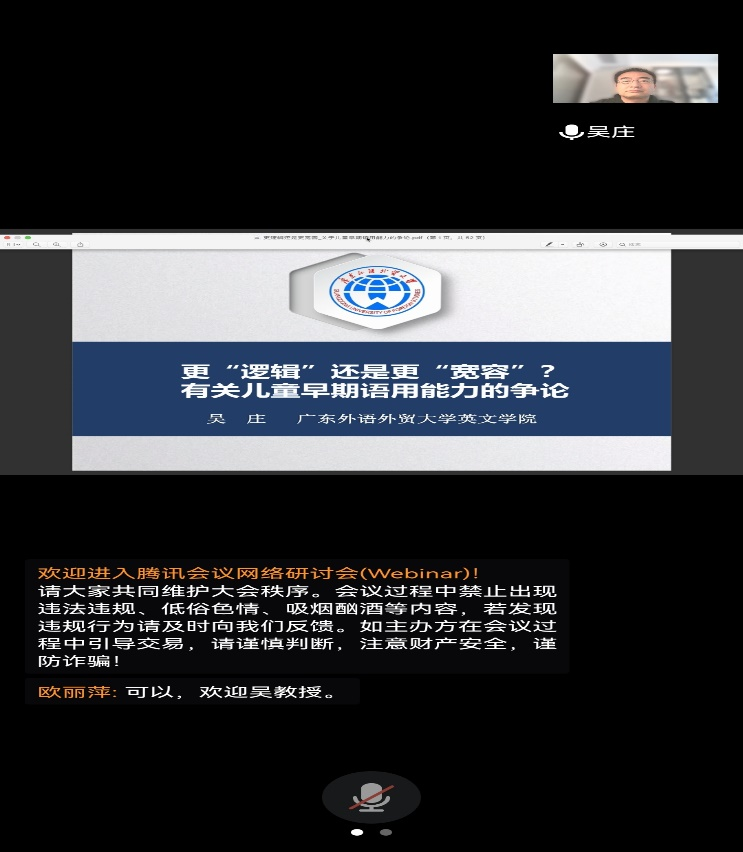 2022年4月19日(星期二)下午,广东外语外贸大学吴庄教授应“乐之论坛”邀请,为52av 师生做了一场题为“更‘逻辑’还是更‘宽容’?有关儿童早期语用能力的争论”的线上学术讲座。讲座由康响英副院长主持,全院100多名师生聆听了此次讲座。