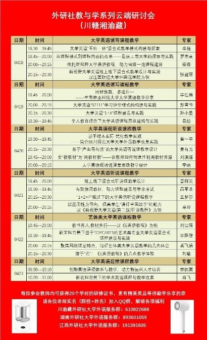 为顺应时势,着眼未来,充分发挥教师队伍“主力军”、课程建设“主战场”、课堂教学“主渠道”作用,提升外语教师教育教学素养,提高外语课堂教学成效,外语教学与研究出版社于2022年4月18日-23日开展为期一周的教与学系列云端研讨会,邀请一线骨干教师,通过经验分享,互动交流等形式,深入挖掘精品外语教材内涵,丰富教学内容,打磨教学设计。