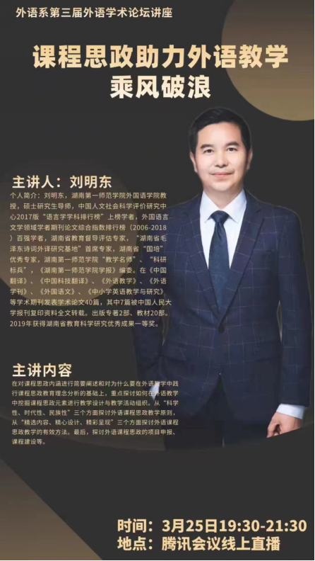 2022年3月25日晚,52av “湖南省毛泽东诗词外译研究基地”首席专家刘明东应邀为山西省长治学院外语系教师进行了题为“课程思政助力外语教学乘风破浪”的学术讲座。