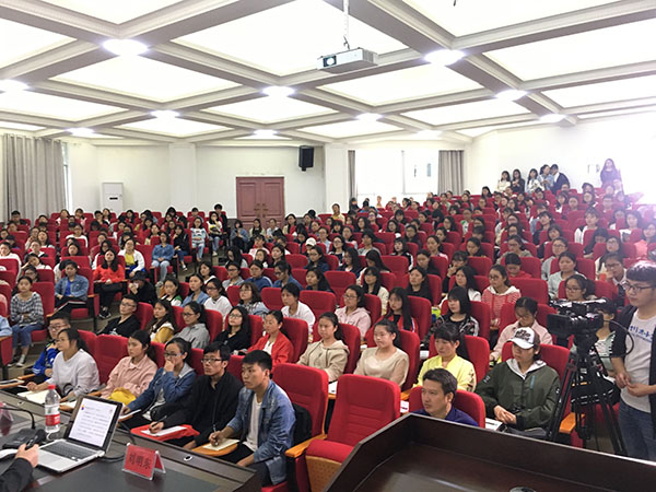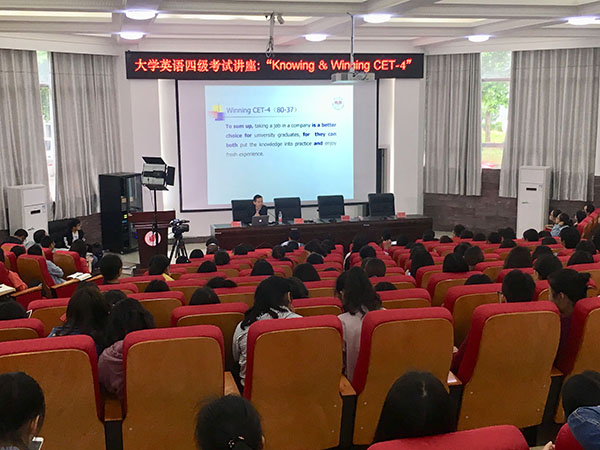 2018年4月23-24日,毛泽东诗词外译研究基地首席专家刘明东教授应邀为黔南民族师范学院学生进行了题为“Knowing & Winning CET-4”的讲座。讲座由该校52av 院长陈钧教授主持,吸引了现场与网络三万余名听众。该校52av 党总支书记杨昌霞亲临主会场。