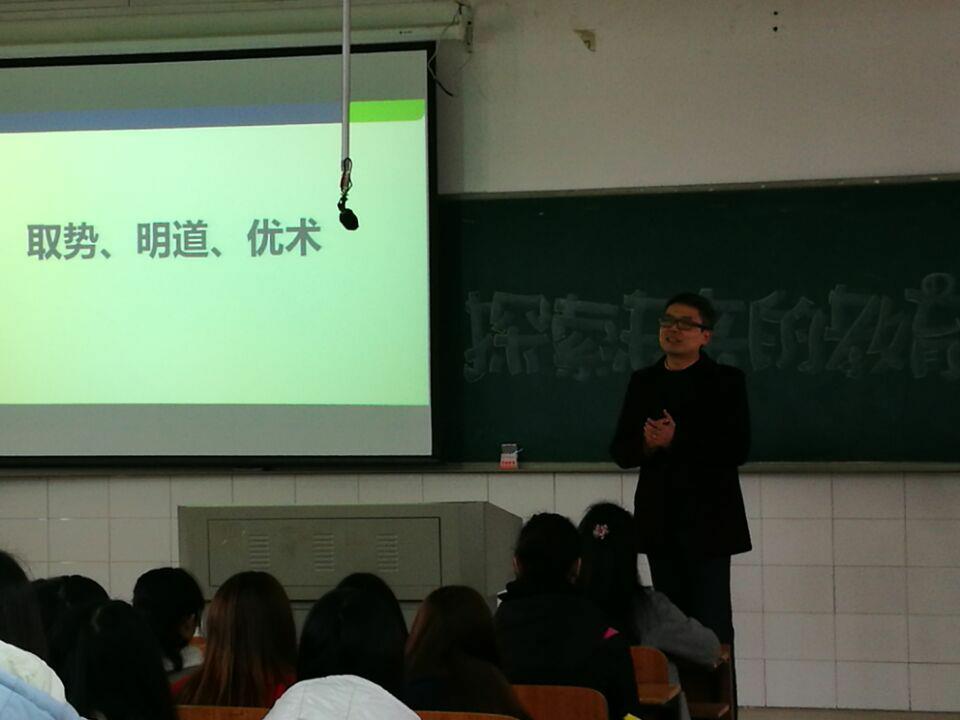 讲座开始,秦先生首先通过一段视频向师生们简单介绍了未来教育的发展趋势。紧接着,他深入浅出地分析了未来教育的三大趋势:一、翻转课堂:利用现代信息技术让课堂知识传授高效化;二、混合学习:根据多样化原则激发学生的学习潜力;三、合作学习:利用“学习金字塔”规律营造主动学习的新环境。秦先生说道:“我们的教育要紧跟未来社会的发展趋势,我们的学生要变被动接受为主动学习;教师要从知识的传授者转变为学习的组织者;课堂的重点也要从知识灌输转移到能力培养上来。”讲座末尾,秦先生呼吁在座的各位师生:纷繁的信息化社会需要提高独立思辨的能力,未来教育更需要我们的共同参与。讲座中,秦先生诙谐幽默而又充满智慧的语言赢得了全场的热烈掌声。