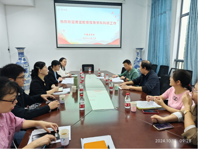 王佳娣对黄坚教授的到来表示热烈欢迎,也对其一直以来对学院学科科研工作的关心和支持表示感谢。她指出,黄坚教授在教学和科研方面都颇有建树,他的指导必将大大提升本次省社科项目申报的质量。刘祥清详细介绍了黄坚教授的学术成就,希望各位老师珍惜机会,认真学习,打磨本子,提高项目命中率。